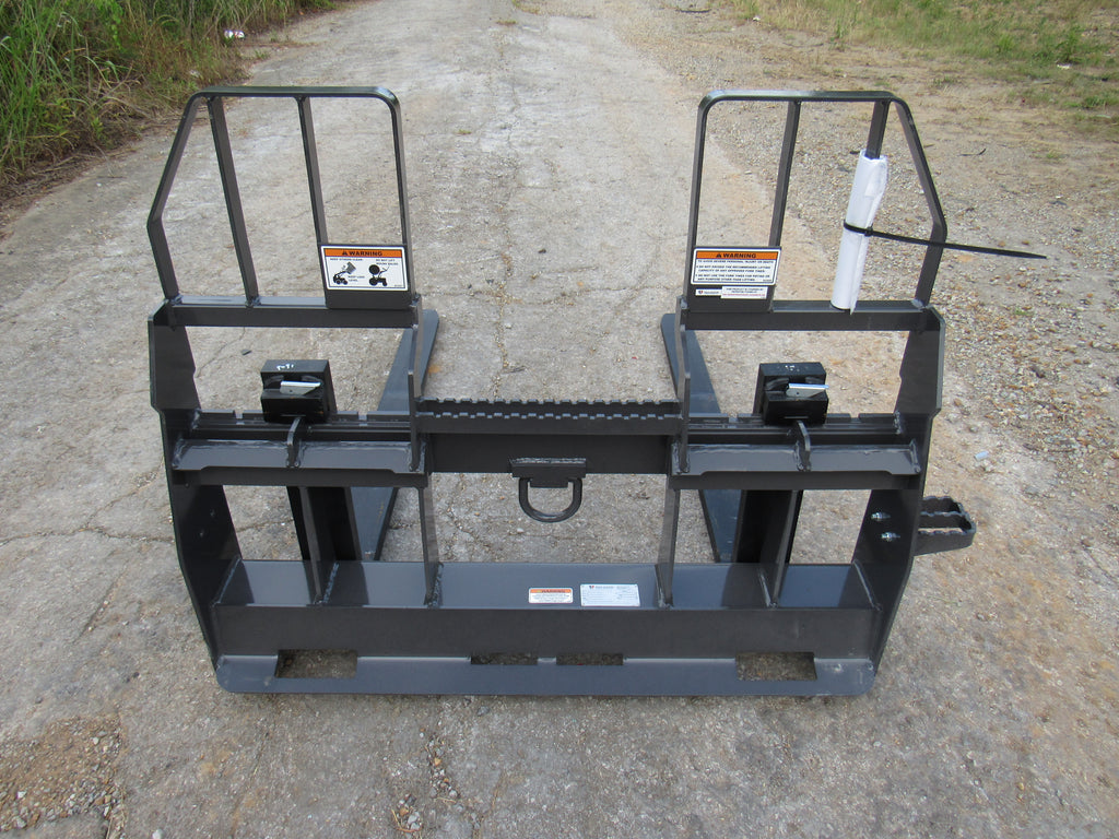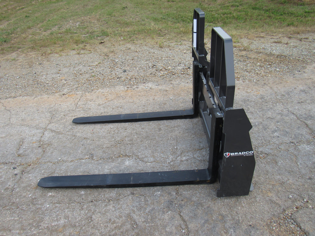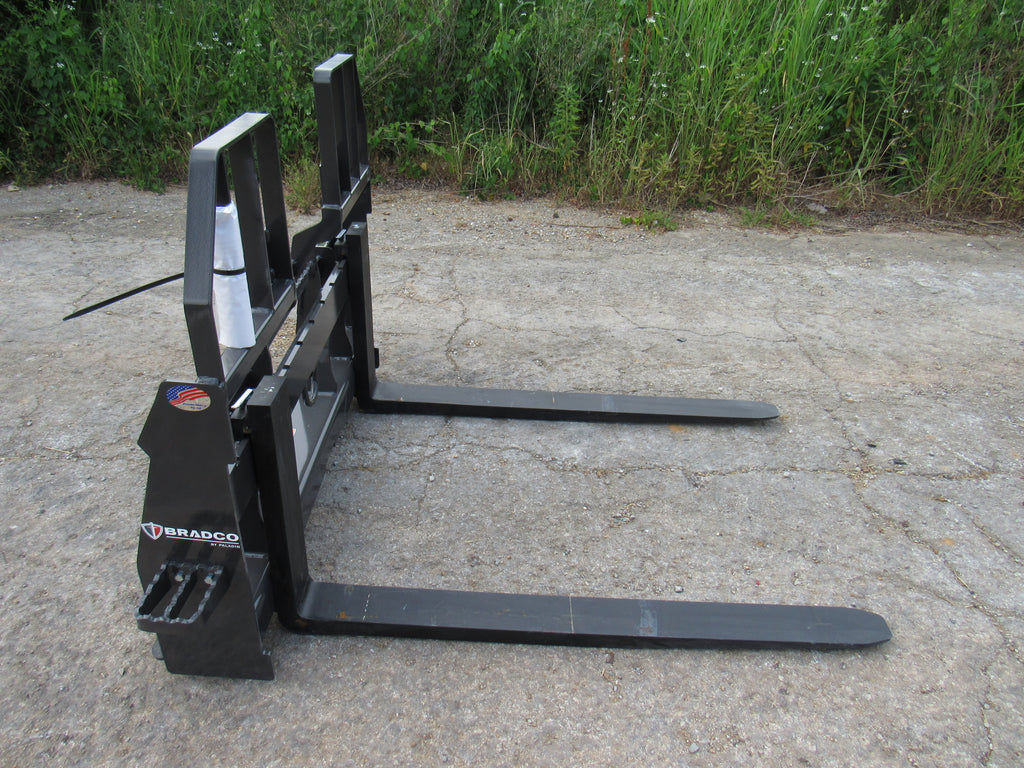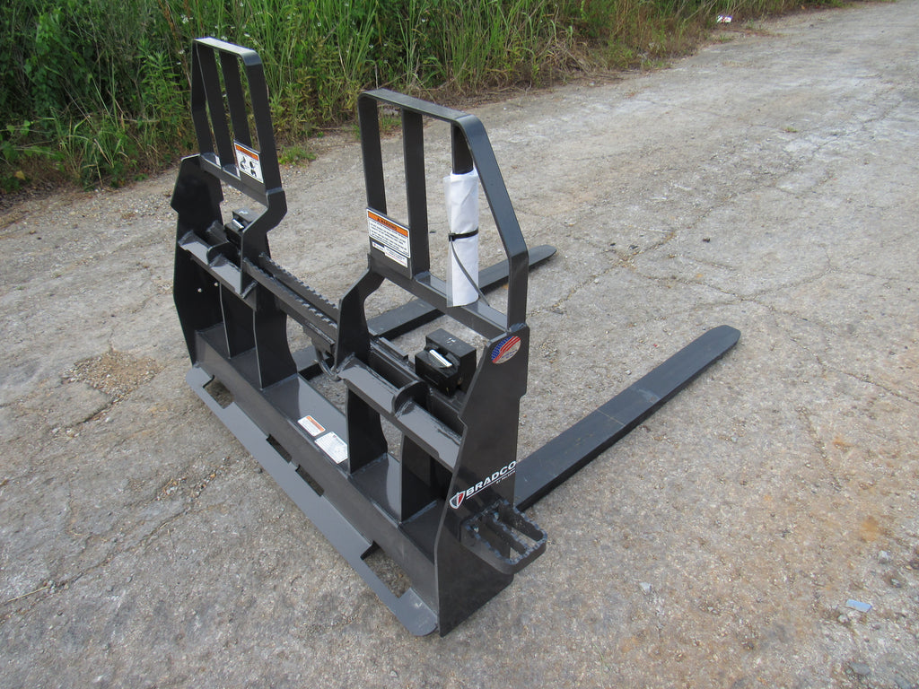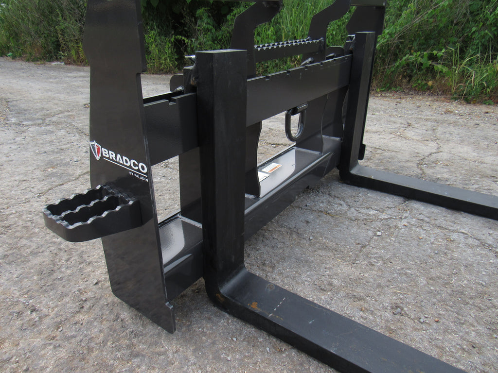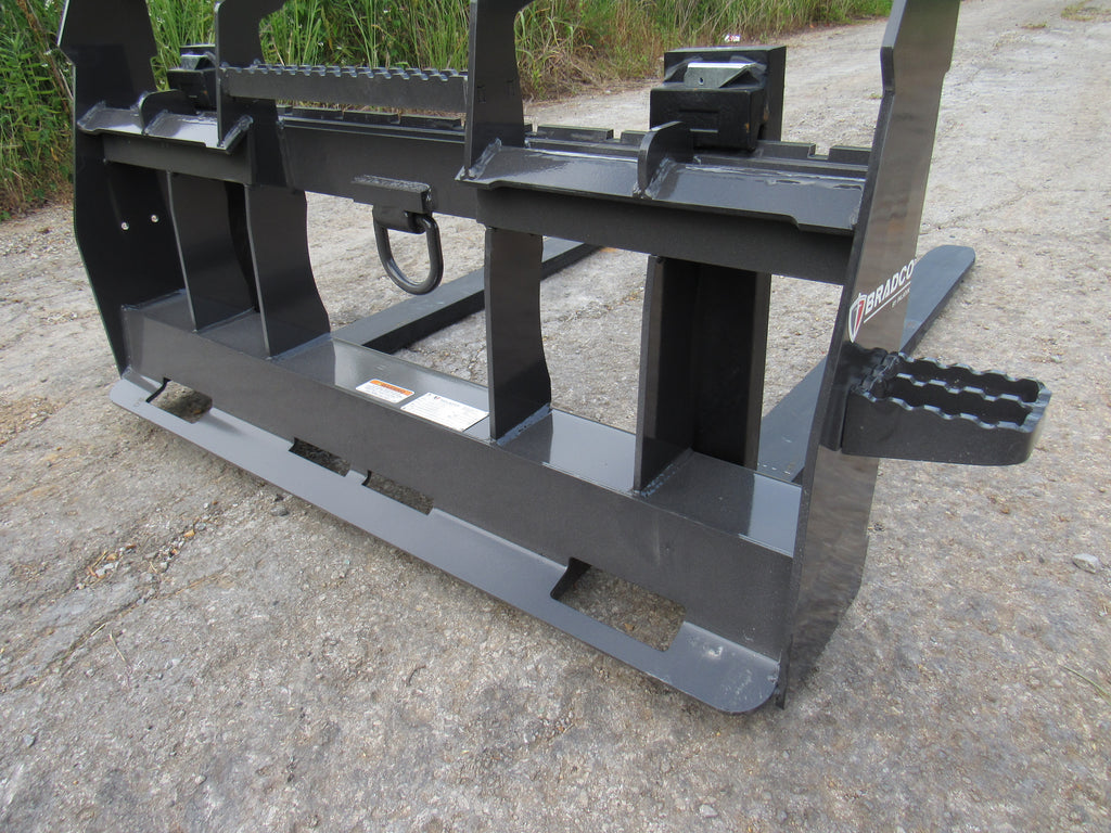 This is the Bradco walk through pallet fork frame. Multiple blade options are available with this frame. This heavy duty frame designed to handle 5,500 pounds. This frame features an open cavity in the center of the brick guard for easy access into the cab of your loader. The frame also features one bolt on side step that can be bolted to either side of the frame. This is a patented design that offers excellent visibility and includes a load securing “D” Ring. Also known as cubing forks or masonry forks, these are designed for moving blocks or bricks around a job site.