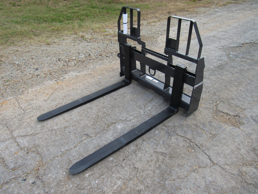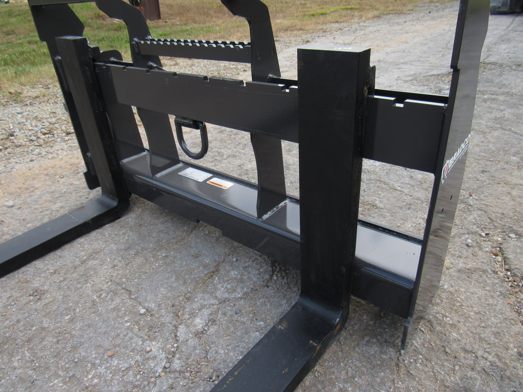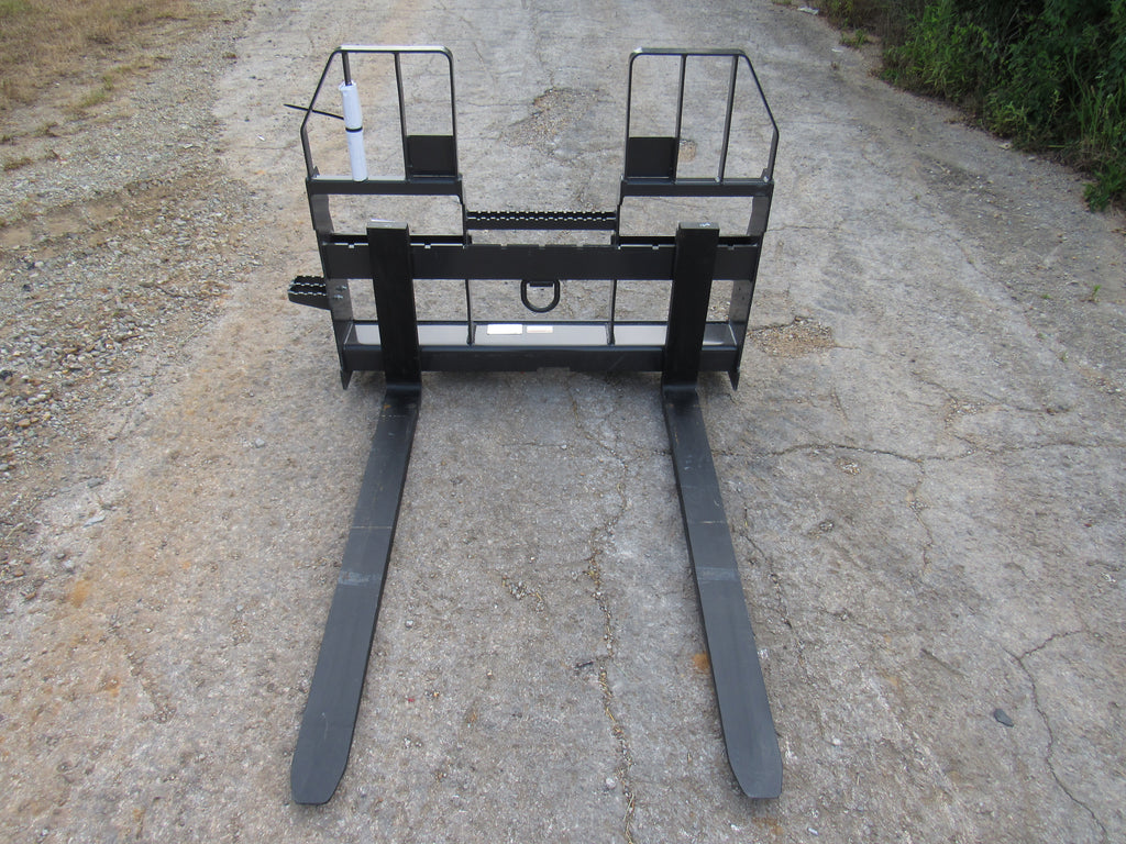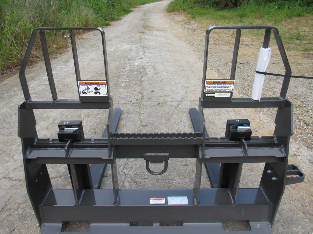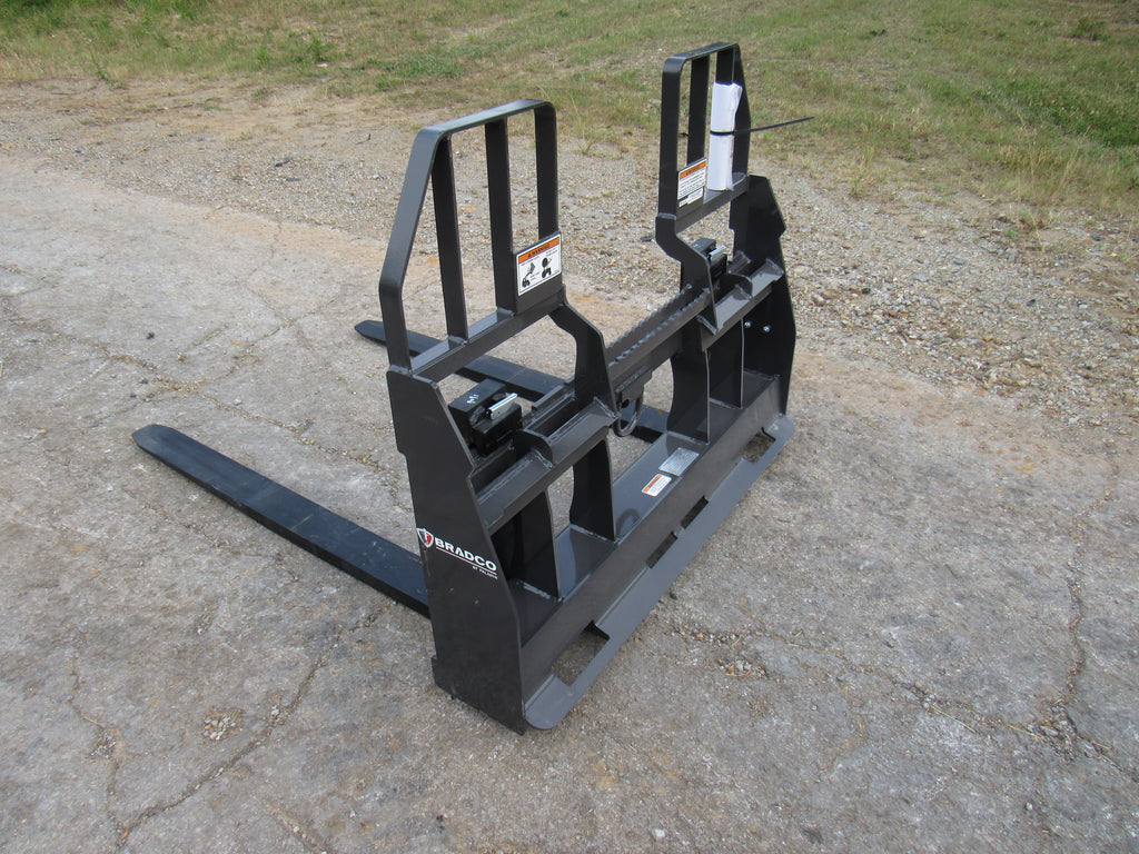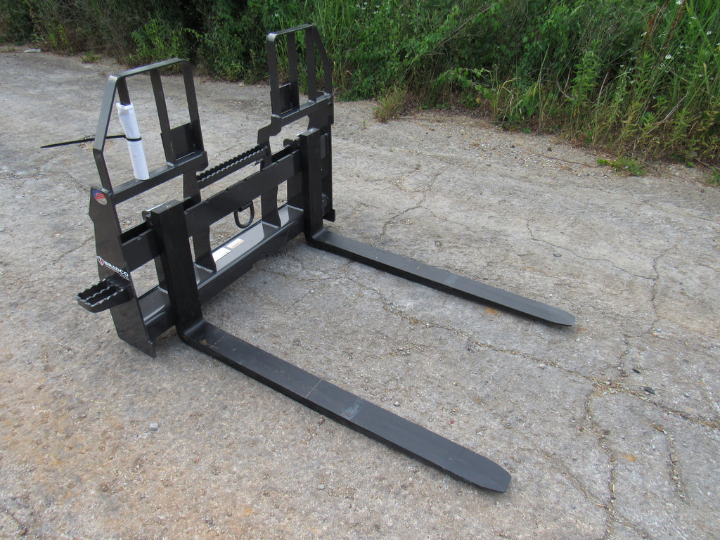 This is the Bradco walk through pallet fork frame. Multiple blade options are available with this frame. This heavy duty frame designed to handle 5,500 pounds. This frame features an open cavity in the center of the brick guard for easy access into the cab of your loader. The frame also features one bolt on side step that can be bolted to either side of the frame. This is a patented design that offers excellent visibility and includes a load securing “D” Ring. Also known as cubing forks or masonry forks, these are designed for moving blocks or bricks around a job site.